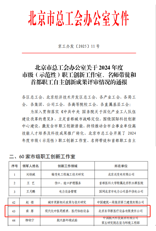 南原創(chuàng )新工作室成立于2019年,2021年獲評昌平區職工創(chuàng )新工作室,是以北京東華原醫療設備有限責任公司研發(fā)負責人、副總經(jīng)理南原為領(lǐng)軍人物,在中醫藥現代化煎煮、醫療健康體檢領(lǐng)域以滿(mǎn)足中醫藥煎煮、醫療健康體檢定制化解決方案為目標的科研團隊。工作室現有成員28名,其中高級工程師7人,中級工程師10人,博士1人,碩士9人。
